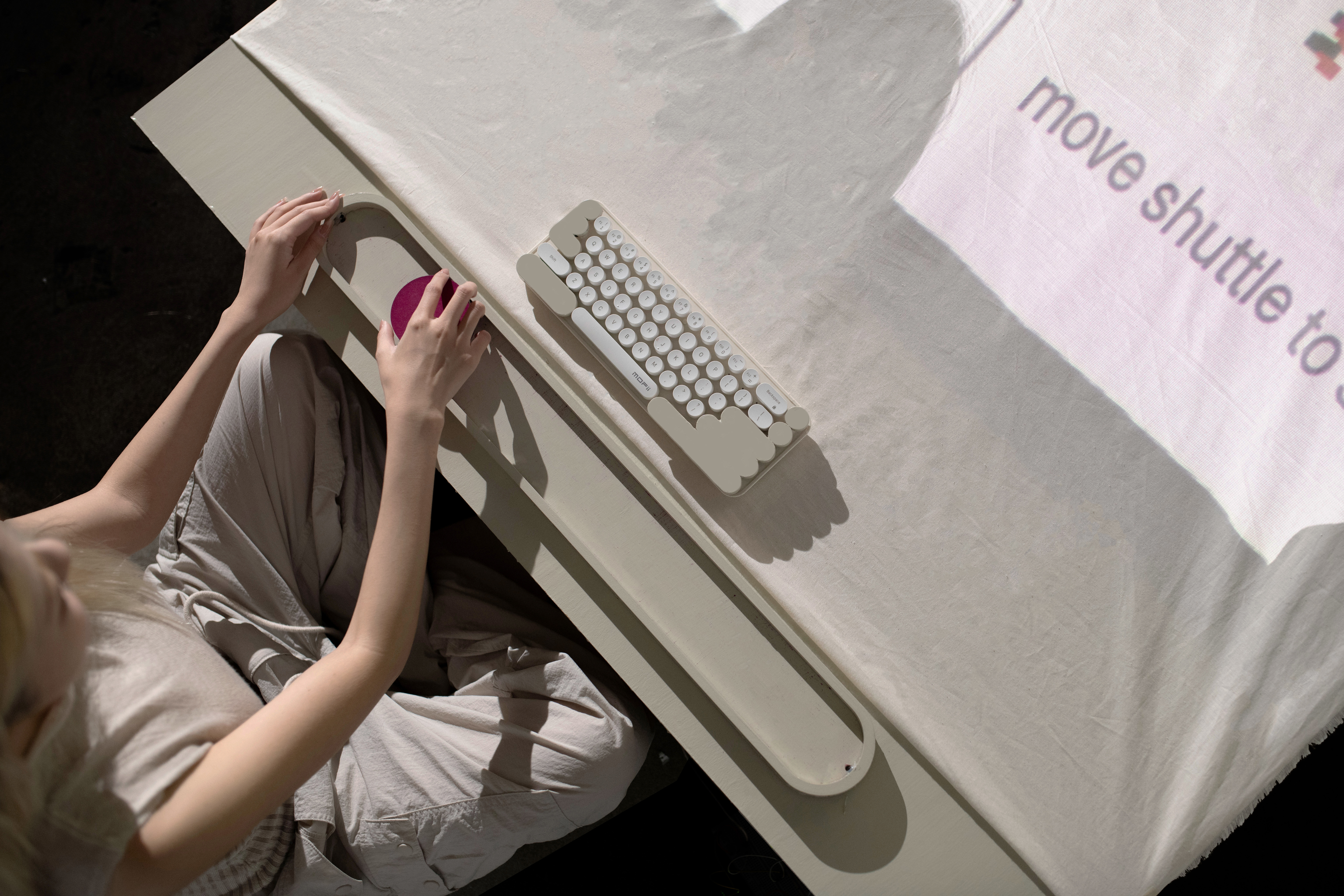 The tabletop tray is designed to resemble a traditional weaving shuttle, integral to carrying threads across a loom. Linked with Arduino code, users must emulate the shuttle's action to transmit messages.